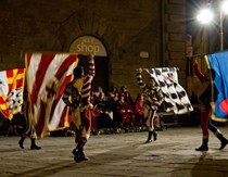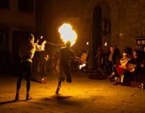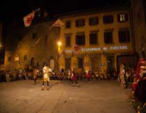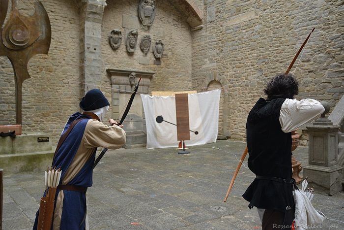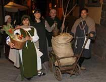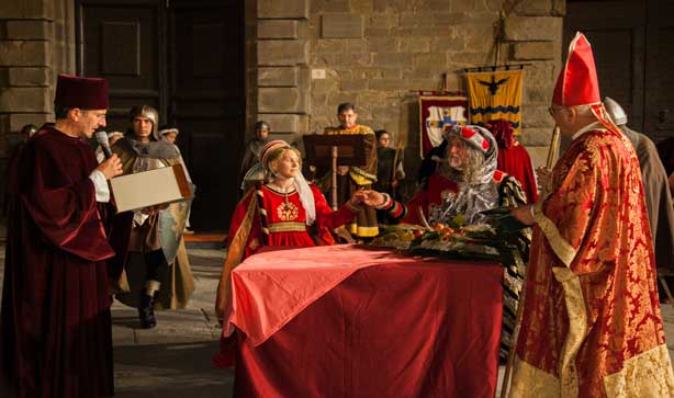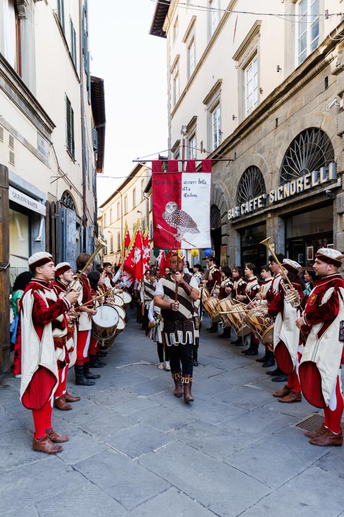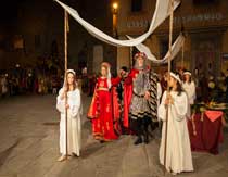 Che abbia inizio la settimana medievale! Tutta la città torna a rivivere usi e costumi del passato. Girando per le piazze si possono incontrare artigiani che modellano il rame, che intrecciano il giunco e creano bellissimi cesti; banchini con spade, pugnali, archi, ma anche libri rilegati in pelle, maschere, gioielli medievali e fiorini cortonesi, utilizzati come moneta di scambio.